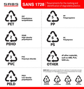 SANS 1728 requires that the plastic material used in the packaging must be presented on the packaging, using a material identification code from 1-7, and contained in a triangle.