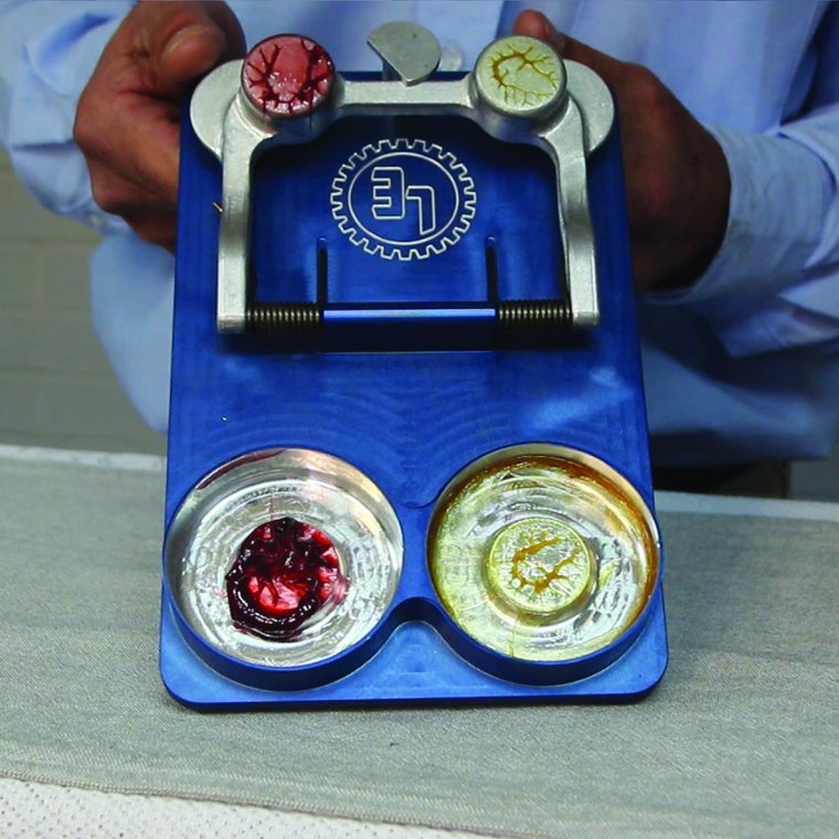 LE national marketing manager Gavin Ford explains that the rat trap test can show how two greases with the same viscosity react differently to the same force or pressure over time. Each lubricant is applied to a plate on the apparatus and then the spring-loaded clapper is released. “When we release it, it hits both plates with the same speed and force. We then compare how the two lubricants have reacted. We can snap the device several times to simulate what would happen over time or with continuous use,” explains Ford.