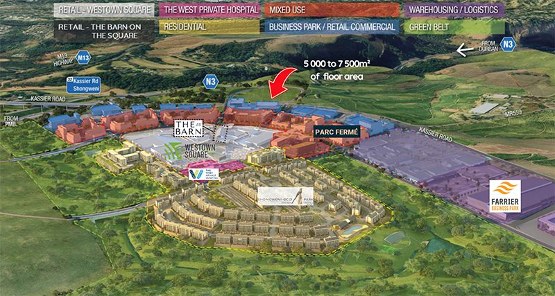 The first of these ‘acquisition opportunities’ (based on a rolling, perpetual 99-year leasehold model along similar lines to the very successful Waterfall development in Midrand, Gauteng) is a call for interest in developing an integrated Commercial and Fuel Station opportunity on a site within Westown, 500m from the N3 with Kassier Rd frontage.